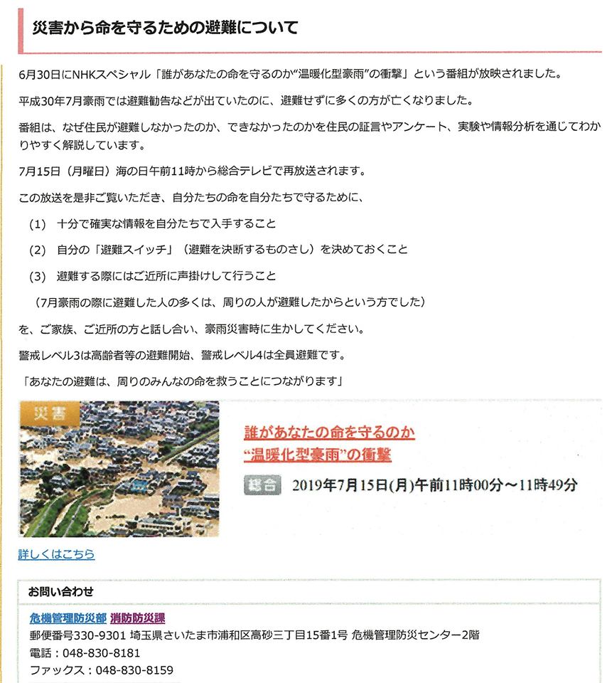 県庁の防災担当課と、豪雨避難対策について協議したところ、この番組について県庁HPで紹介。感謝。ぜひぜひ!(録画して)ご覧ください!!