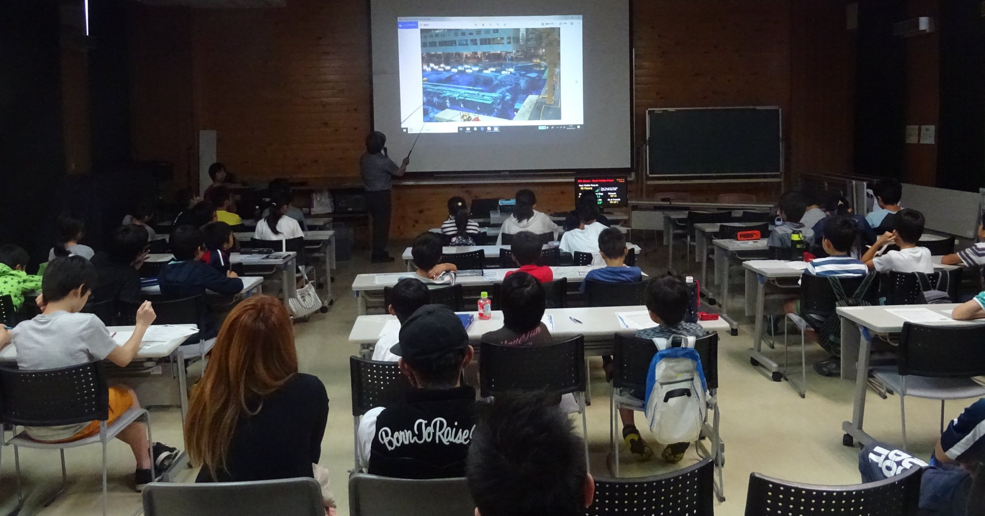 講演会場には常時、宇宙ステーションのライブ映像が。(パワーポイント以外に)