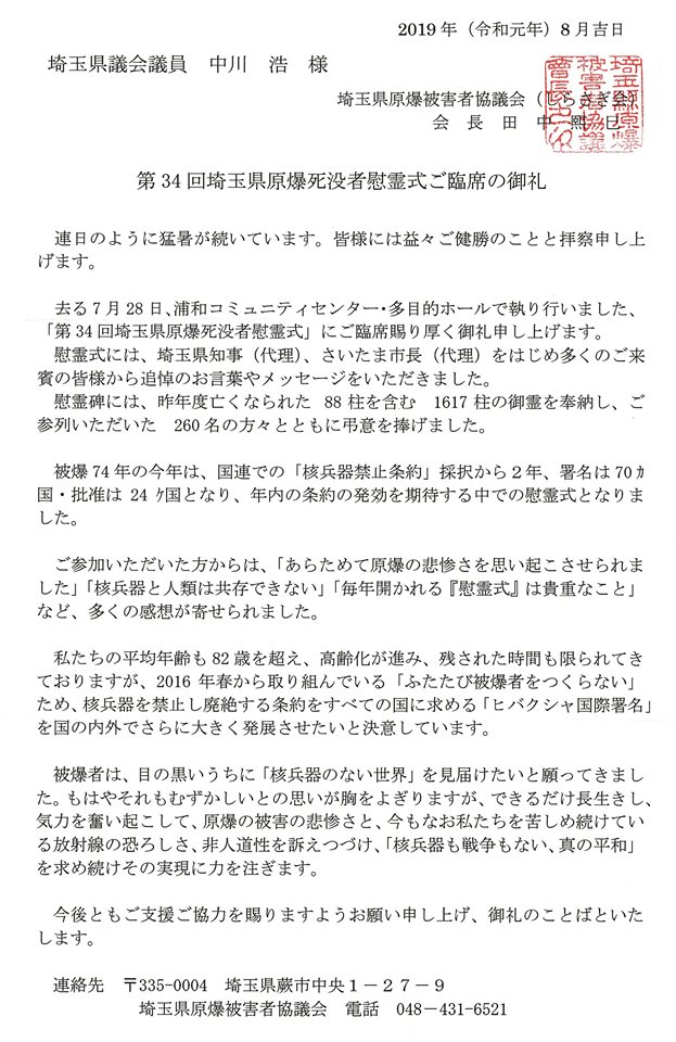 ノーベル平和賞受賞(ICAN)式で演説した田中てるみ さん(日本原水爆被害者団体協議会会長)からのお礼状には「目の黒いうちに、核の無い世界を見届けたい」と書かれ、単なるDMと思って捨てられません。私だけの物でなく、私は市民の方々の代理なので。