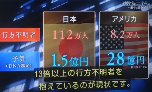 日本人で亡くなり遺骨が見つかっていない方の人数は、米国人の14倍多いのに、予算は、米国のほうが19倍多い。(死者1人あたり266倍の予算の違い)