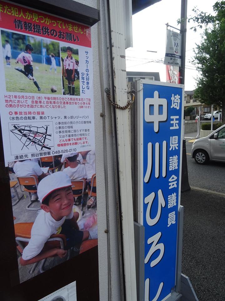 【熊谷・小学生ひき逃げ】事件のポスターをプリントoutして、ひろし事務所前に2か所貼りました。