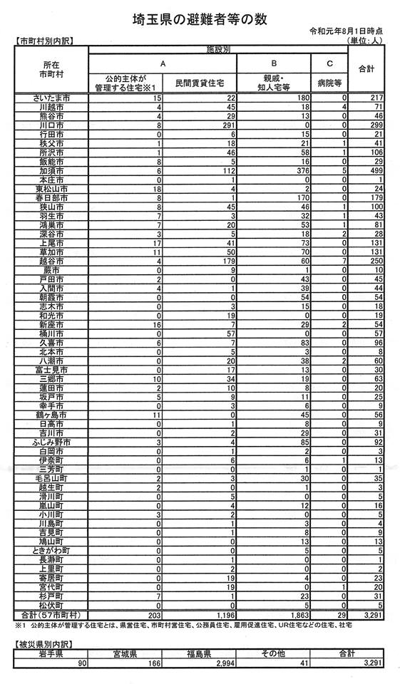 県内市町村別 東日本大震災 避難者数(出身県別には、下段に書かれています)