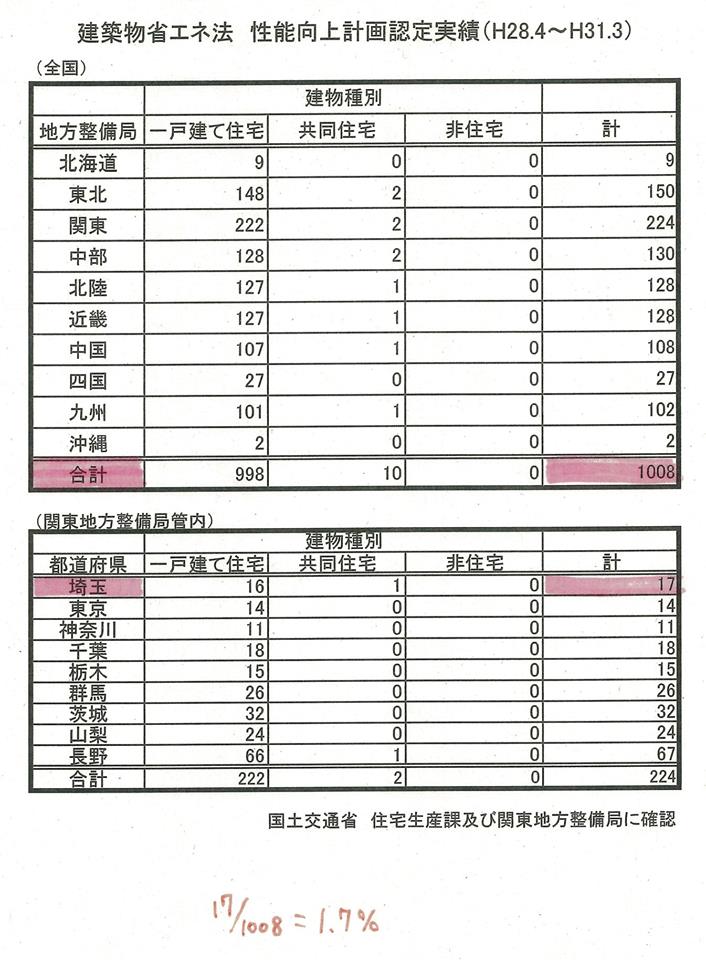 全国に占める埼玉県の住宅戸数は5.4%、事業所数は4.5%ですが、『省エネ建築物』で埼玉県は、全国47都道府県の1.7%しか実績がなく、なぜこのように他県よりも埼玉県が劣っているのか分析をしていないのに、手数料を多くとろうとしている。