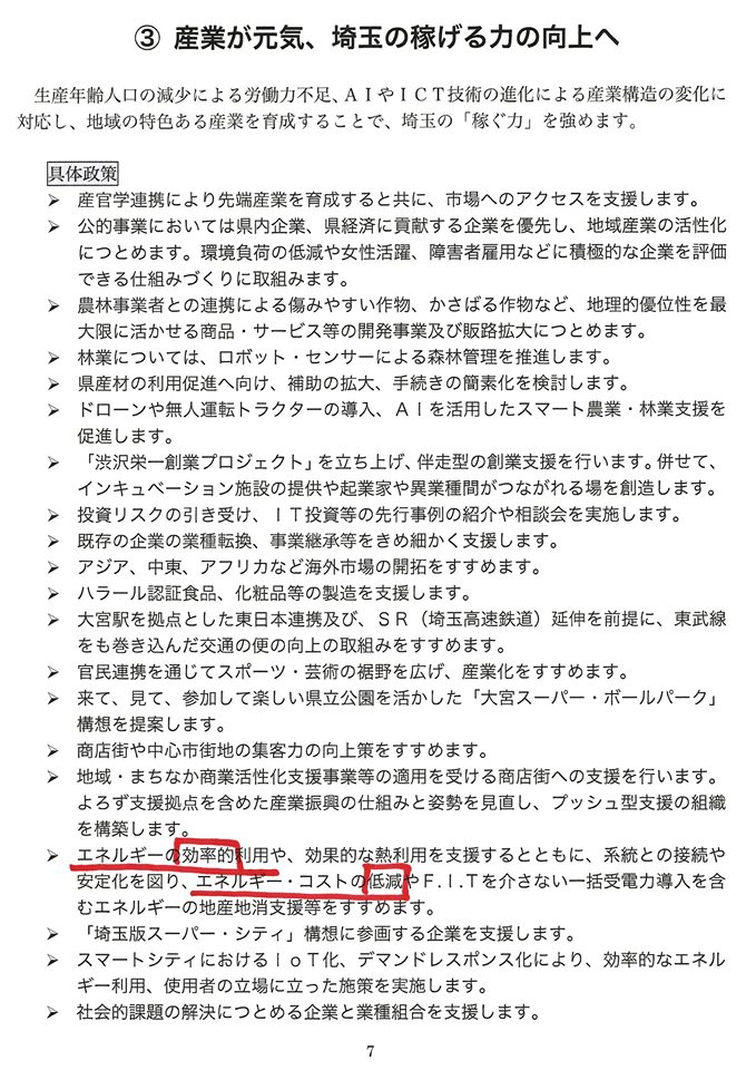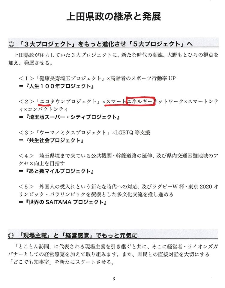 📷写真は【大野知事の公約】のうち、『住宅の省エネ化』をはじめ『省エネ』関係が⬇こんなに(赤い字)ある(抜粋)。