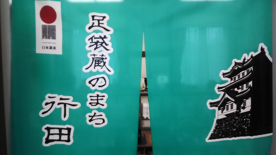 上田知事時代から、知事の応接室にある【行田・足袋】と忍城の『のれん』。
