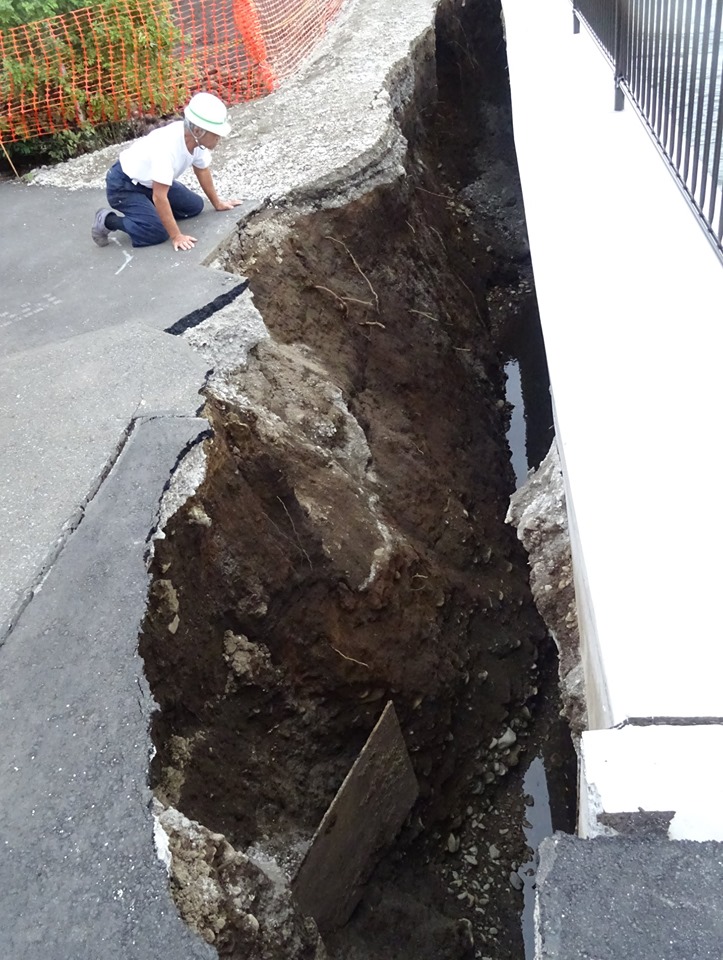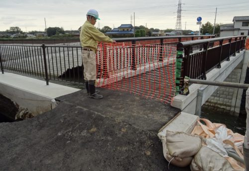 中学生などが通らないように、陥没した所の橋を閉鎖してもらいました。(周辺に柵もあるのですが、更に)