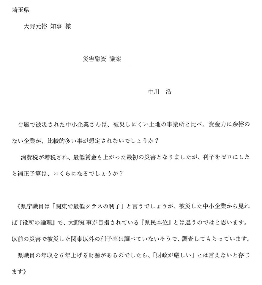 🌀台風被害の中小企業】への対応について、県議会(産業労働委員会)の審議では(📷概略)、 千葉たつや県議(加須市)から「『利子補てん』を県庁が行って、利子を限りなくゼロに出来ないのか?」など質問がありましたが、県庁は関東・広島・愛媛・岡山県しか他県の状況を調べておらず(東北なども被災していますが)、利子率を下げる検討を行っていない。 (つづく)