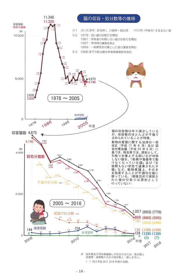 1万1320匹の1986年をピークに、ボランティア・動物病院さんなどのご努力・協力で、昨年595匹(うち 子猫が82%)まで、殺処分するネコを減らして来れました。