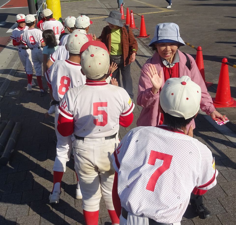 少年野球の選手30人や、まだ小学生でない👧チビちゃんも『ハイ✋タッチ』ボランティア☺。