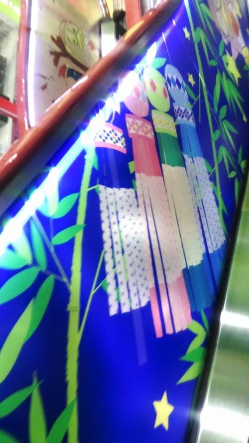 🎋【七夕】祭りで有名な仙台市。『ドン・キホーテ』では、(📷)エレベーターの扉や、エスカレーターの両枠が、『七夕デザイン』でした😊。行政や(観光客の利用する)駅などでなく、民間が街のPRをして下さるのは、ありがたいですね。