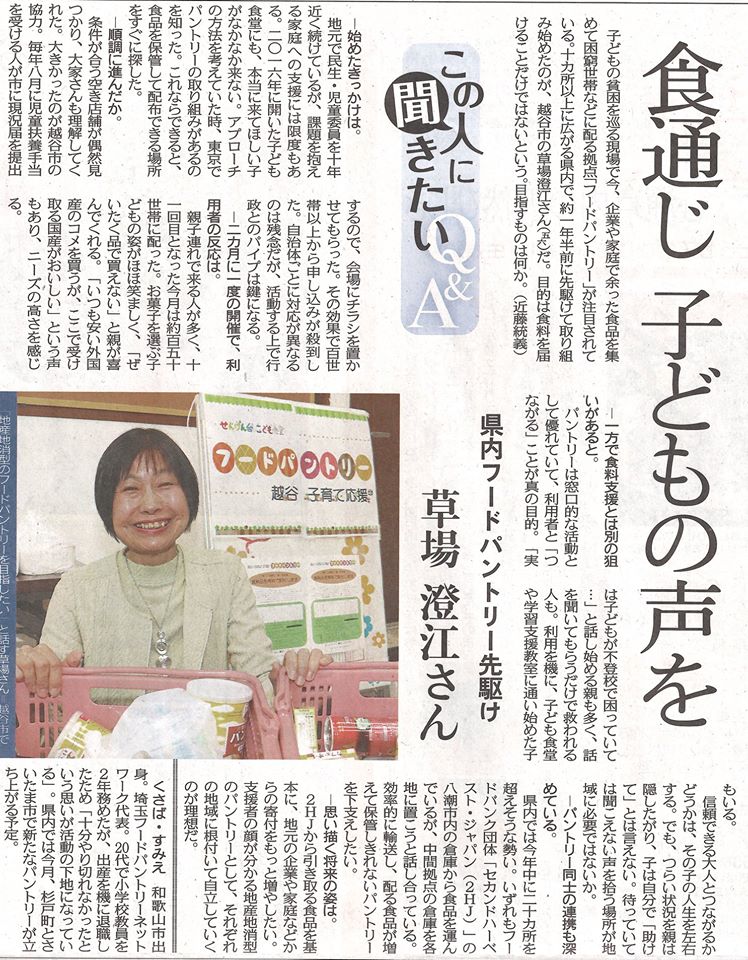 埼玉県内の市町村で唯一、越谷市役所が、児童扶養手当などの助成を受けている方への通知に、『フードバンク(正確に言うとフードパントリー)』のチラシを入れて、必要な人が登録する仕組みを作っている(フードパントリーを運営するのは、ボランティア団体)。