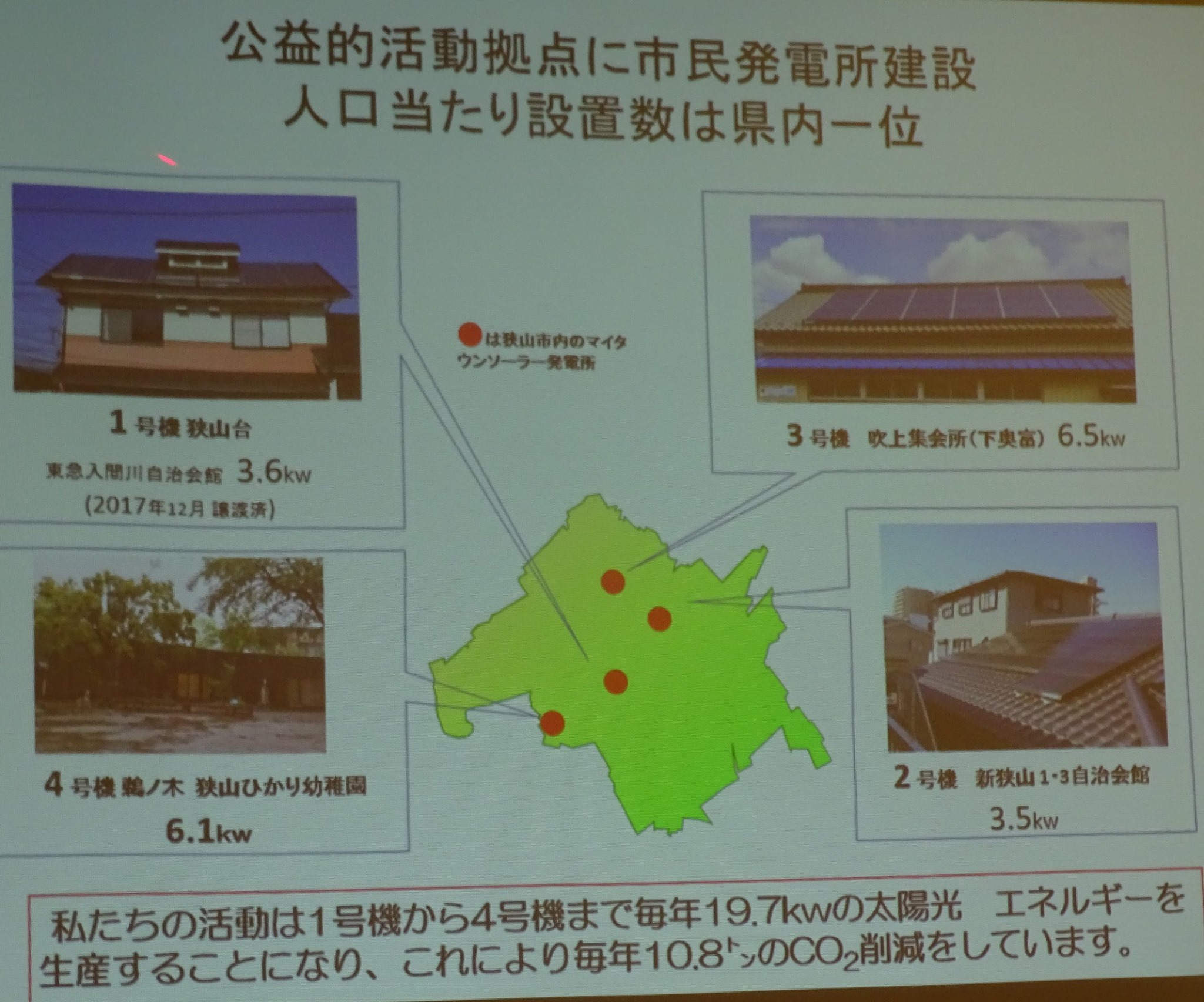 「狭山市内の自治会館・幼稚園といった公益施設での『太陽光発電設置個所数』は、県内1番☝(人口当たり)」さやま環境市民ネットワーク 環境団体交流会での発表。