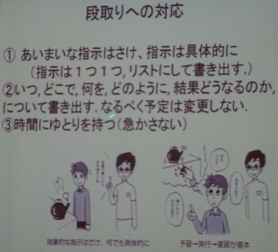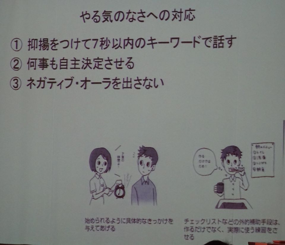 子どもには5秒以内・大人には7秒以内の言葉で話す。憶えられない事は復唱する。横ヤリを入れない。出来るだけ、予定の変更はしない。指示は具体的に。ほめるより、認める。