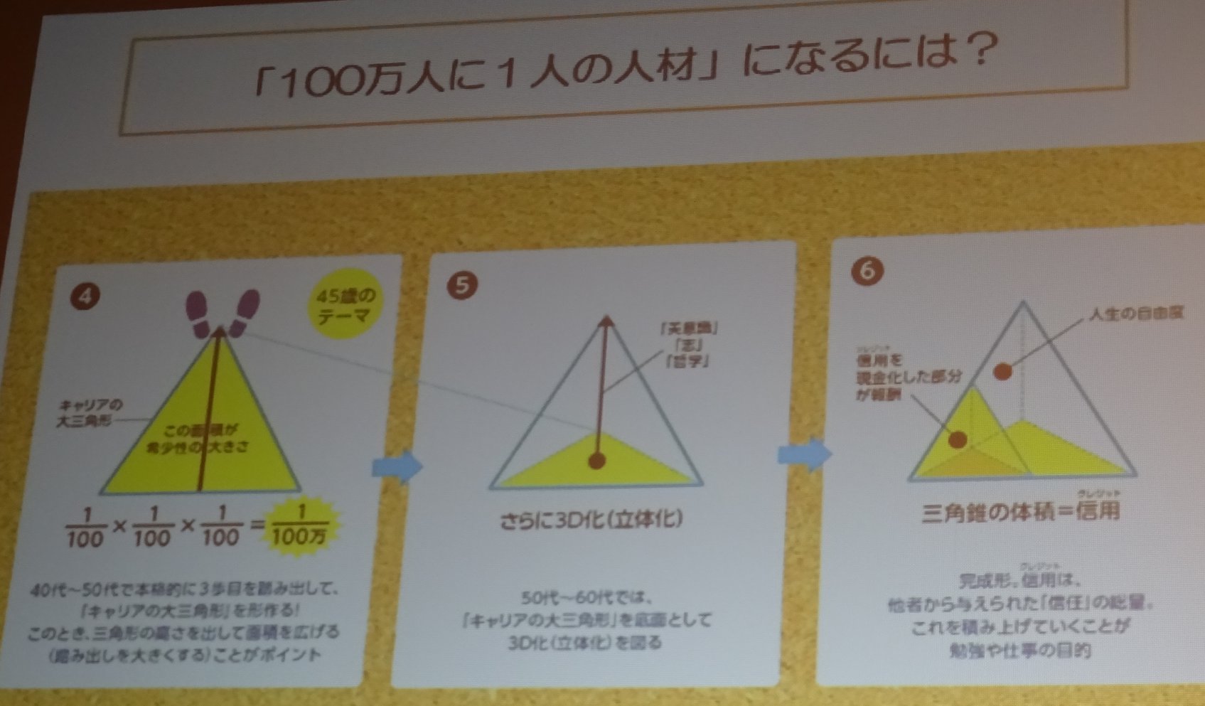 藤原さん「1つの仕事(左足)を例えば1万時間でマスター。次に別の仕事(右足)を同じく。三角形が大きくなると、希少性が上がる。それを次に3D化。キングコングの西野さんは、漫才と絵本作家」。