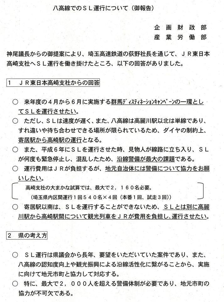 県議会として観光客誘致・地域活性化の為、神尾 議長をはじめ私も所属する議員連盟でJRに陳情を重ねた結果、各自治体が警備に責任を持つ条件付きで運行が決まりました。