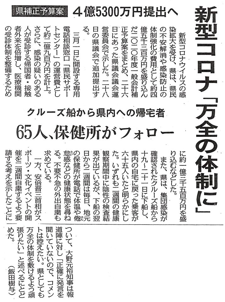 県議会で、私は『コロナウイルス』対策について質問する準備をしております。何かありましたら、ご連絡下さい。