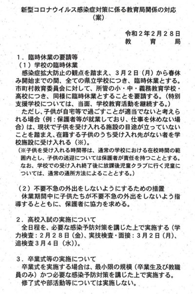 大野知事と、先ほど直接話しました。後ほど報告致しますが、特別支援学校は休校にしないどの事。