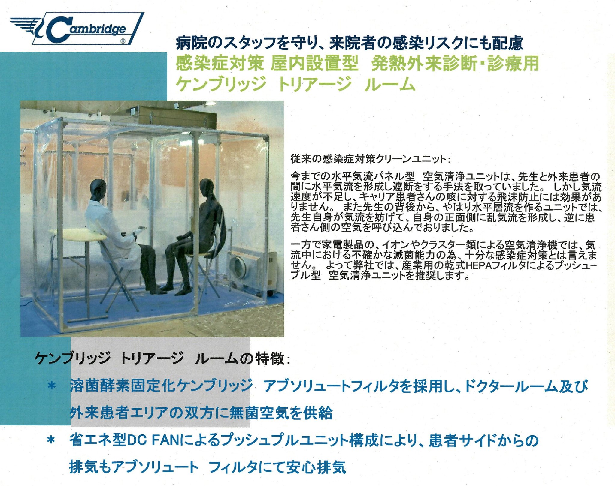 一般の方が利用しない専門病院での外来診療の安全を更に確保する為、申し出のあった3病院に写真のような設備を整備すべく、準備が進んでいます。
