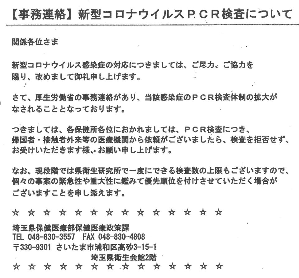 コロナウイルス対策の根幹【医師からのPCR検査依頼を保健所が断らないように】通達文