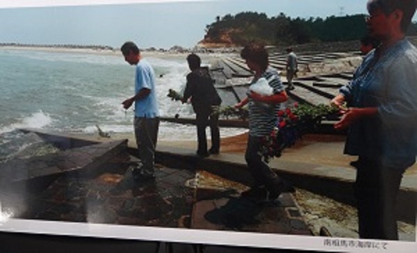 津波で亡くなった家族を想い、海に花をたむける(福島県南相馬市)。