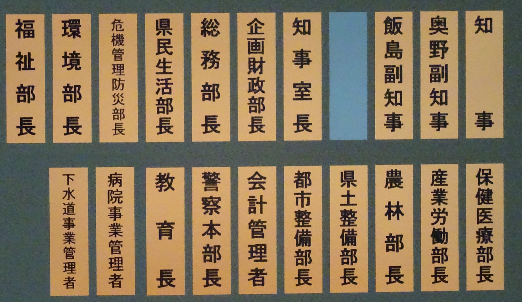 📷写真は、県庁に今、管理職はいるか分かるランプです(い ないと灰色になります)。午後8時まで、ご覧のようでし た。