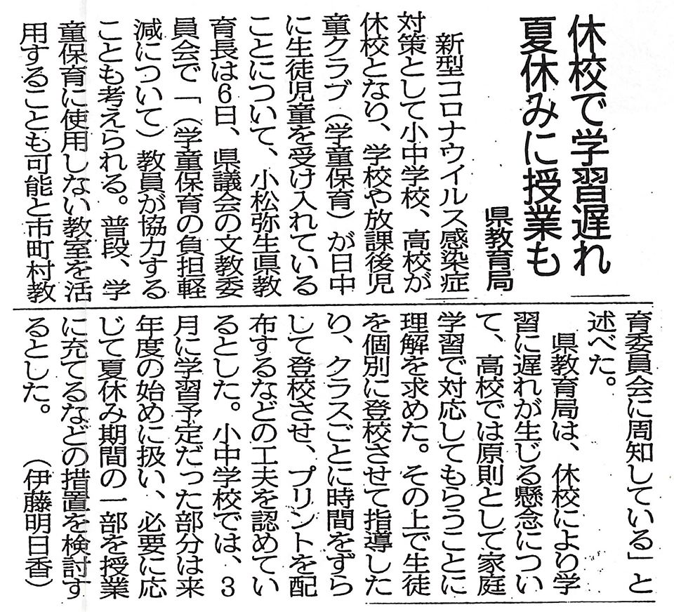 たとえば『県内で休校していない所』『給食を出している所』がどこか。市町村が知りたいと思っていても、目の前の対応で忙しく難しい。県庁が市町村(学校)に聞くのでなく、(各教育事務所をはじめ)何百人も県教育委員会には職員がいるので、どう情報を集めるのか。大変なのは、市町村の現場なので、県教委の応援体制の再構築について、今日話しました。
