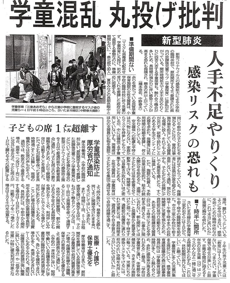 普段、学童を利用していない子達の事で言うと、学校が やっていれば、先生と保護者くらいが接触者。ところがや っていないと、接触者は増える。