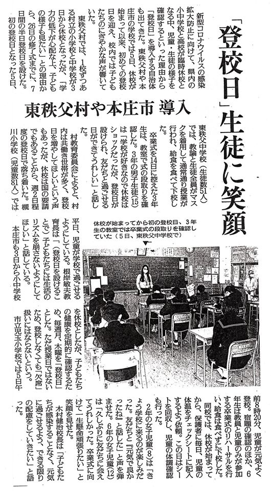 埼玉県 本庄市では、毎週月・木曜日を登校日。東秩父村では、3