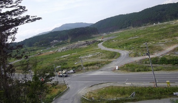陸前高田市の市街地を海岸側から見た。建物はほとんど取り壊された。