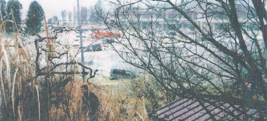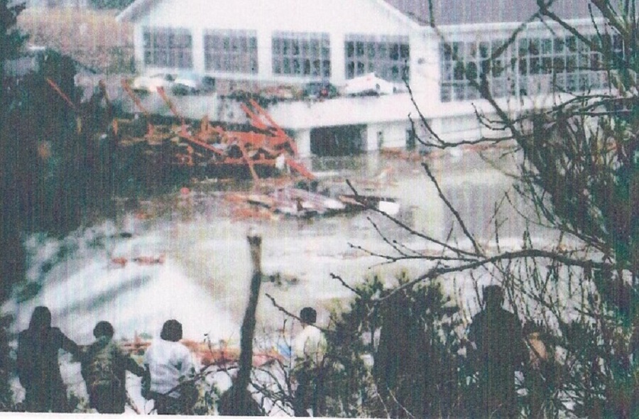 体育館のベランダに車が打ち上げられているのが見える。体育館は2階まで浸水、ガラスが割られている。