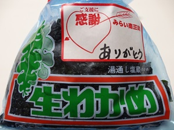 南三陸の被災者の方々が販売している”三陸わかめ”(200g350円。飲食店での販売は単価別。)