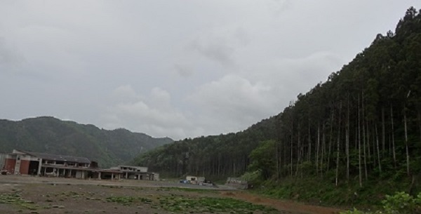 大川小学校の脇にある山。土砂崩れの恐れを考えるか。津波からの避難を考えるか。