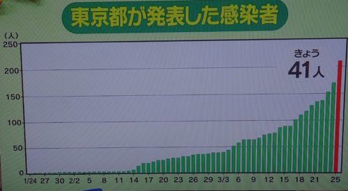 東京都のコロナウイルス感染者を、都知事は「最近増えた」と言っていますが、写真の2月中までの少なさのほうをご覧下さい。海外から来た人(帰国者含め)の空港での体温全員検査を未だせず、また2月中までに、PCR検査を医師が求めても保健所がそれを行わなかった事の2つが主原因で『感染経路が分からなくなった』のであって、都民の責任(自粛による家計悪化)になってしまっているのは、違うと思う。(41人に増えたのには、理由がある)