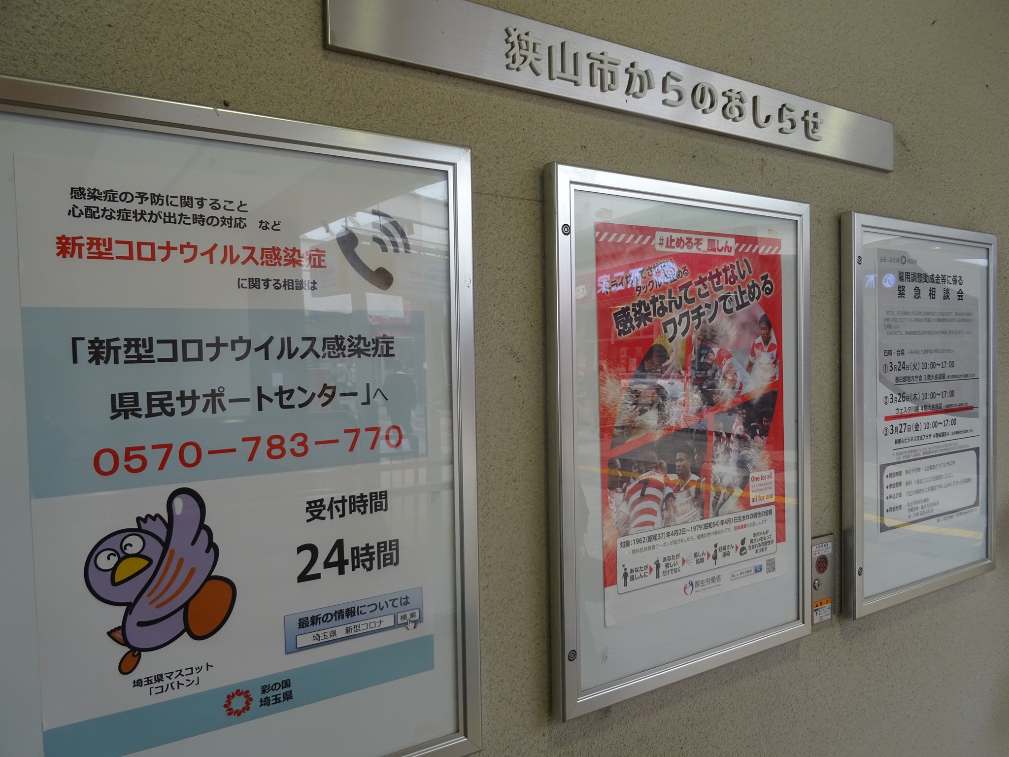 駅に市役所が貼れるポスター3枚のうち、2枚が県庁のコロナウイルス関係。感謝。