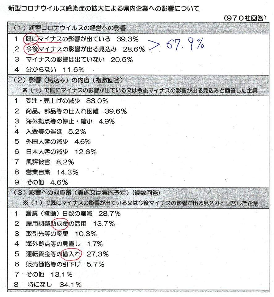 単なる『数字』ではなく、調査にお答え頂いた民間事業者の状況を県庁がリアルに考えられるか。まず、この調査結果を県庁職員9千人の何人が知っているか?(膨大な資料の中で、担当外の分野の何を気にするか)今日、コロナウイルス対策のある担当課 管理職に聞いたら、知らなかったので、私から説明しました。コロナウイルスの総合的対策とする為に。 (全17ページのうち、最重要と思われる2/3ページをここでは掲載)