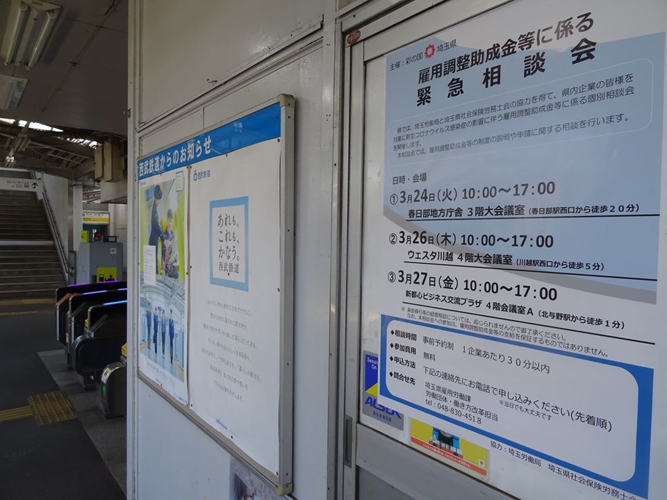 🚃西武鉄道さんのご厚意で、『コロナウィルスの影響で売上が悪化し、従業員の雇用の維持に悩む県内のお店・会社を対象とした県庁主催 個別相談会』のポスターを、市内全4駅に貼って下さいました。民間事業者なのに、とてもありがたいです。