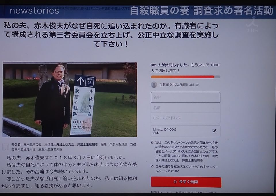 キャンペーン・私の夫、赤木俊夫がなぜ自死に追い込まれたのか。有識者によって構成される第三者委員会を立ち上げ、公正中立な調査を実施して下さい!