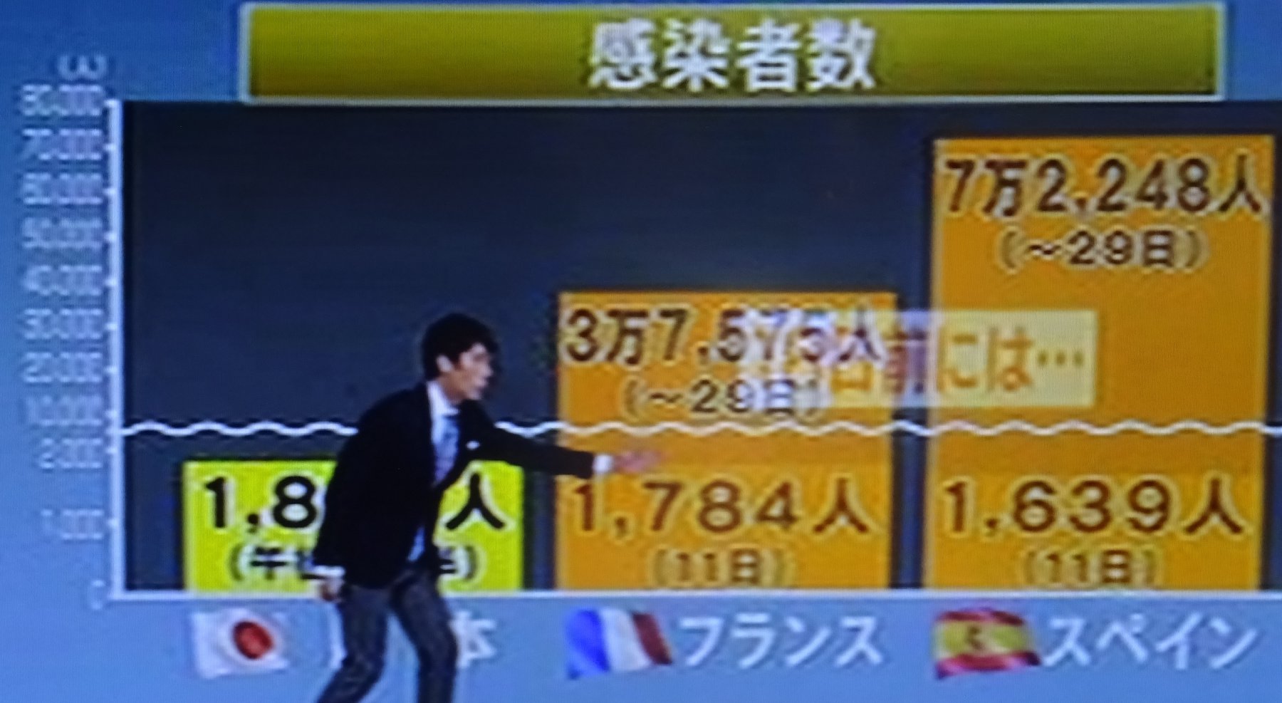 グラフの(報道される部分の)説明をすると「日本の現在の陽性者数と、18日前のフランス・スペインの陽性者数は、ほぼ同じで、今後この人数をその二カ国のように増やさない為にはどうすればいいか」。国民に強いるだけ?