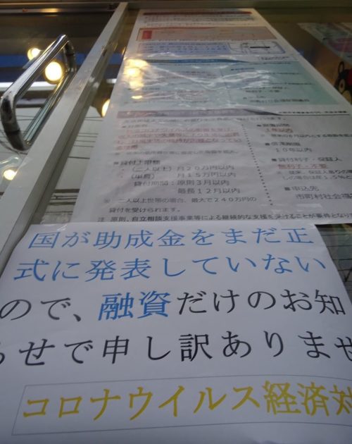 コロナウイルスの影響で、生活が苦しくなった方への【助成金】を、国がまだ正式には発表していません。国は「融資で借りたお金をその後助成する」との考えを『言ってはいる』ので、チラシを作る際に担当者と「国の動きをどこまで書けるか?」(「国が検討中の事あり」などといった表現を)相談したのですが、結果として国の動きの事は一切書けず、私たちに出来るのは、融資のお知らせだけで、申し訳ありません。