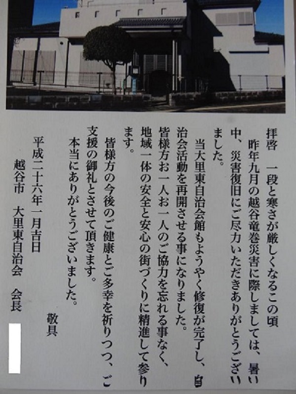 昨年の、埼玉県越谷市の竜巻で一番被害が大きかった自治会から、今日お礼のお手紙を頂きました。