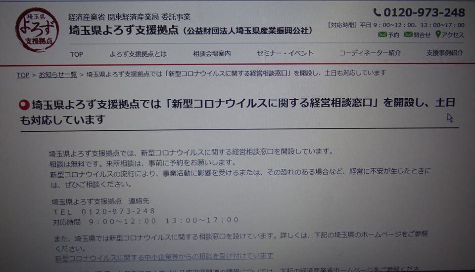 埼玉県よろず支援拠点では「新型コロナウイルスに関する経営相談窓口」を開設し、土日も対応しています- 埼玉県よろず支援拠点(公益財団法人埼玉県産業振興公社)オフィシャルサイト