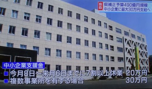 コロナウイルスの影響で経営が悪化した県内の中小企業などに『最大30万円』を支給する方向で調整しているとの事。支援金の対象となるのは、コロナウイルス感染拡大防止の為、【4月8日から来月6日までの間に7割以上休業している中小企業に20万円、複数の事業所を有する場合は30万円】を支給する方針。