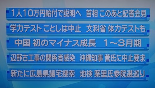 TV埼玉のニュースでは、【全国のニュース】のコーナーがあり(写真)、今はコロナでこんな事態なので、この枠でのコロナの情報提供についても、TV埼玉に話しました。昨日はニュースの中で総理会見を中継し、12分も全国のニュースでした。全国のニュースなら他の放送局でもやるのに。