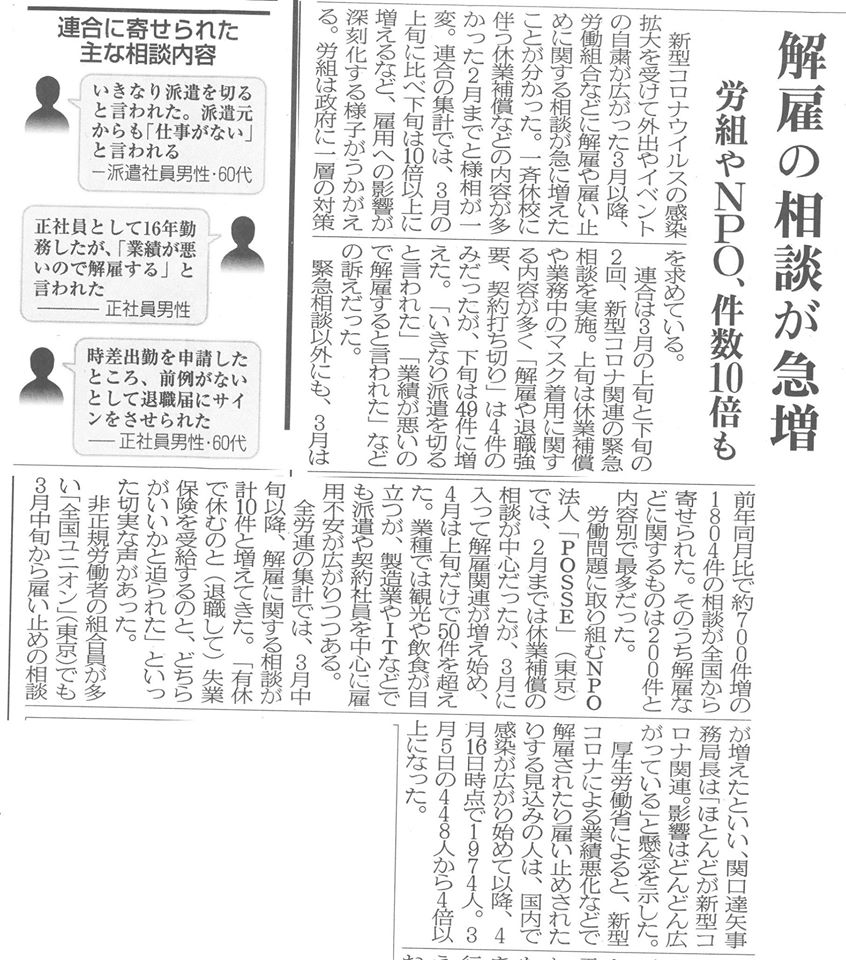 県庁は事業主への『助成金 相談会』は今月末までに6回行っており、来月も行いますが、労働者相談の電話窓口を明確にしておらず、私は相談窓口の民間委託が必要だと考え、(労働組合)連合埼玉の役員さんや、民間の相談機関の専門家の方に相談しています。