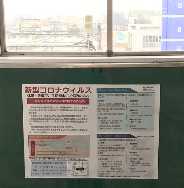に、経済的に苦しい家庭・個人事業主の方への 【無利子融資】の案内ポスターを貼りました。
