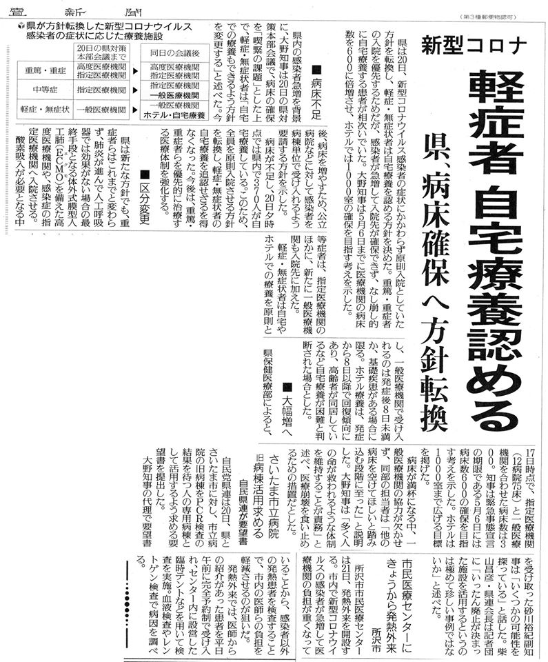 県庁は「対応に問題は無い」と記者会見しているが、少なくとも病床・ホテルの確保に問題があるのは明らかで、不適切発言。向き合う姿勢自体に大きな問題がありそう。 (写真は、読売新聞。21日朝刊)