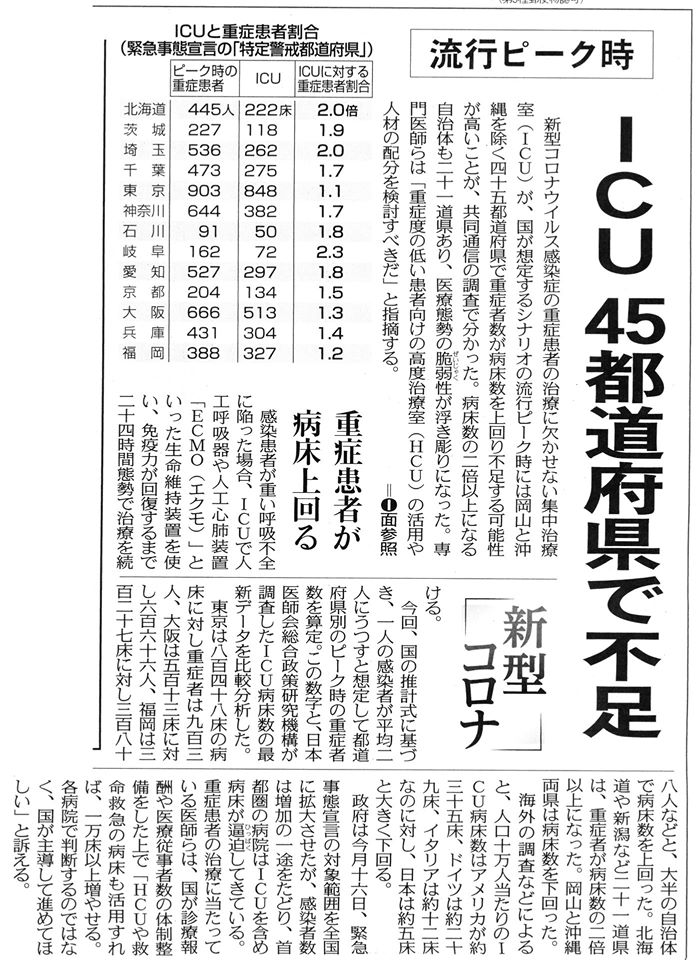 【埼玉県の集中治療室(ICU)の病床数は全国ワースト3】。医療従事者も少ない中では、神奈川県のように急いで仮設病棟を建設し、スタッフを集中させたほうがいいように思う。時間が無い。