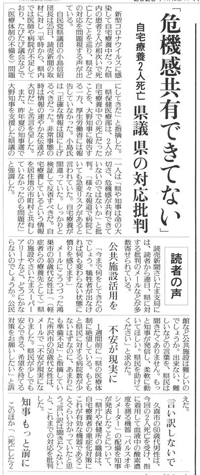 記事をお読み下さい。ちなみに記事にある「県議の1人」は私ではありませんが、このような声は強まっていくと思います。県議が『知事派』とか思ってると、県民が何人も余計に死ぬ。(今朝の読売新聞)