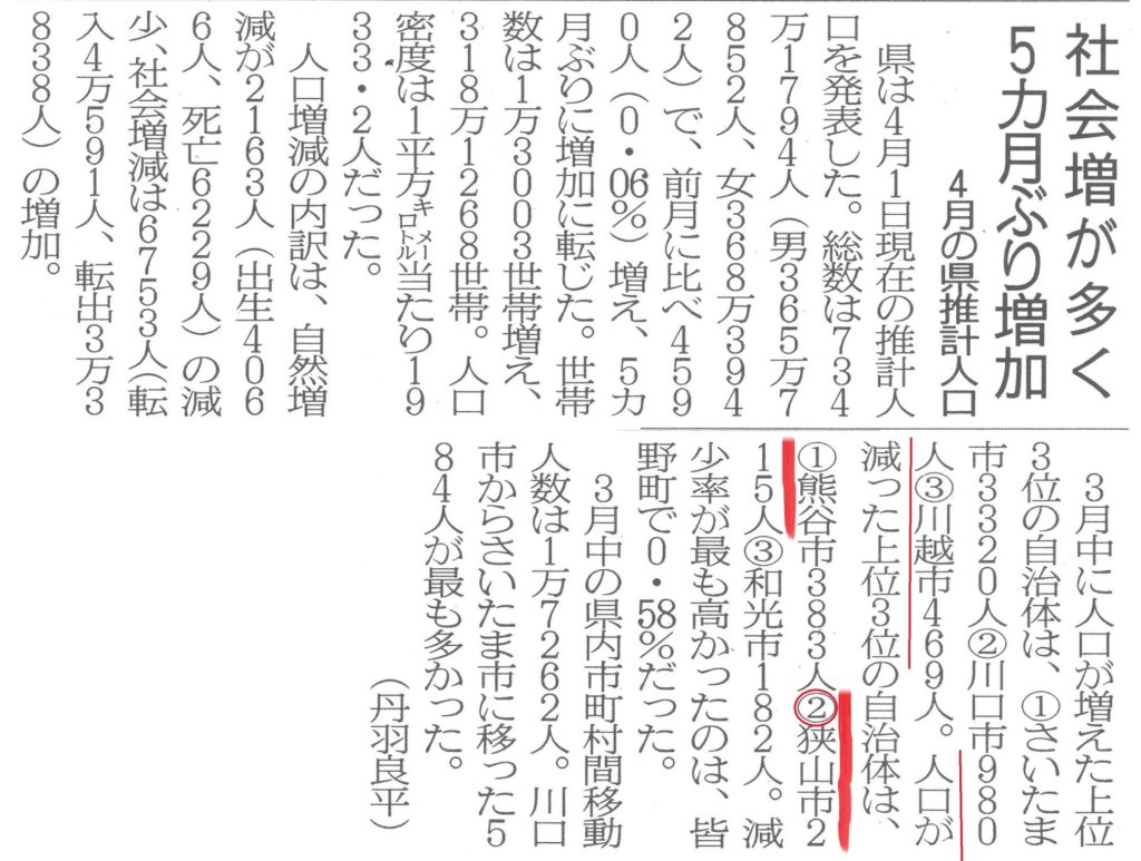 狭山市の人口は、先月(4月)【県内2番目の減少】だったとの事。狭山市の減少数が県内で3番目以内なのは、今回で何回目か。データは対策を考える上で、大事です。特にシビアな情報こそ、より大切。