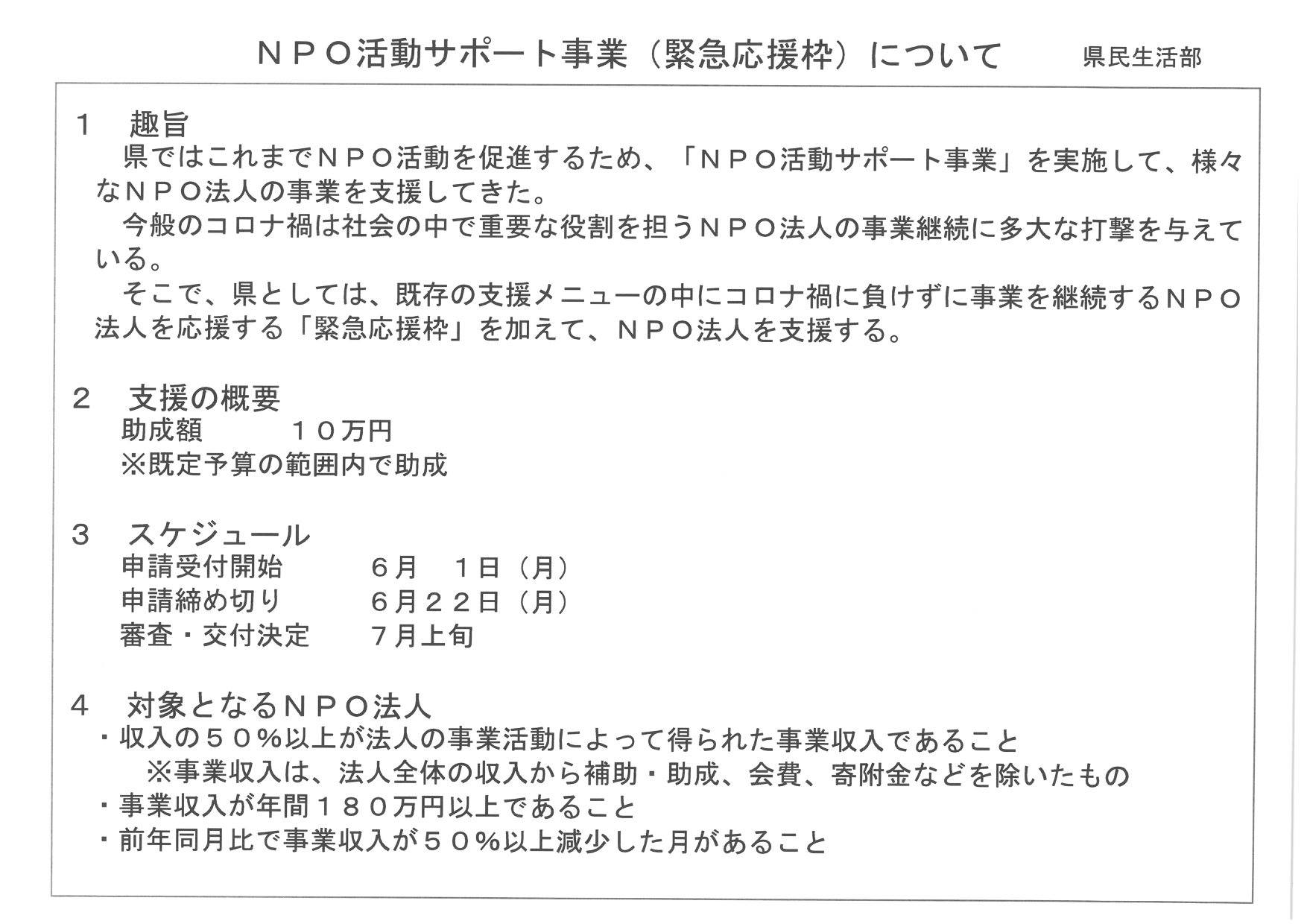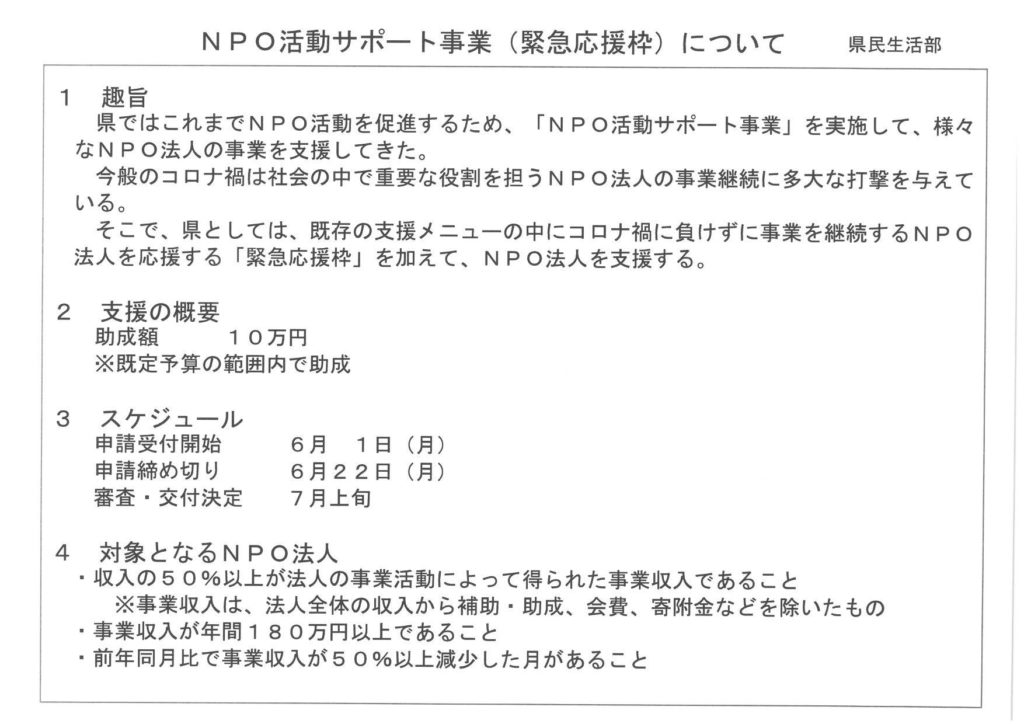 コロナで休業を余儀なくされていた【NPO】への埼玉県庁の対応が、発表になりました。明日(火)報道されると思います(現時点で、100事業所を想定しているとの事)。